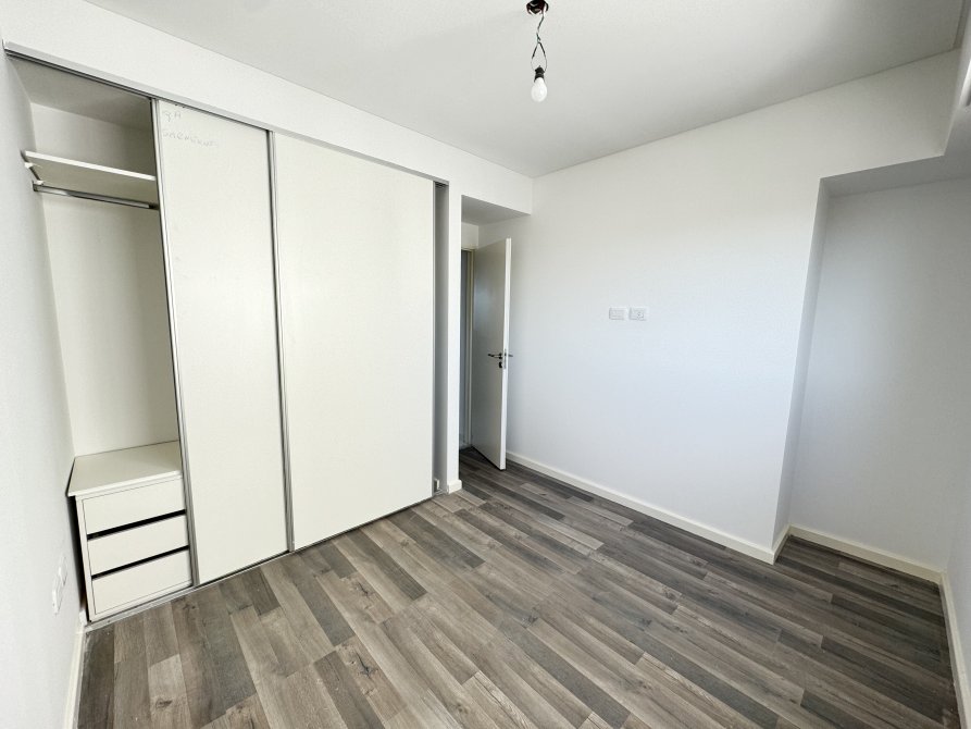 El departamento cuenta con un amplio living-comedor con salida a amplio balcón con vista al frente; cocina semi-integrada con barra divisoria; baño completo con accesorios marca Roca de primera línea; dos dormitorios con pisos flotantes, uno de ellos con vestidor y baño en suite completo. Posee una cochera con posibilidad de añadir una segunda.